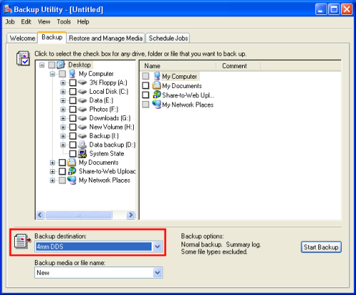 - Click the Backup tab as shown below, and under Backup destination, your tape drive format should appear. In the example, a DDS 3 tape drive has been installed, so the Backup destination is 4mm DDS.