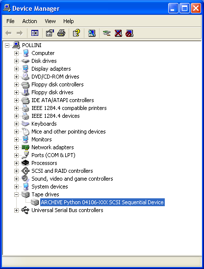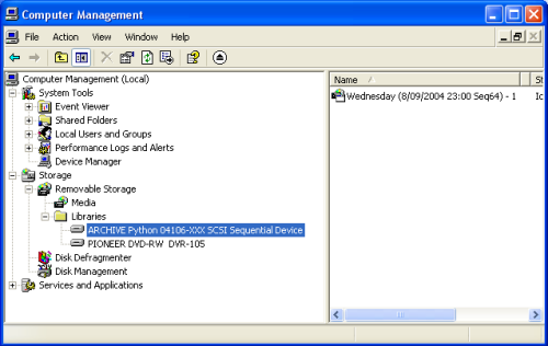 - Expand the tree called Storage > Removable Storage > Libraries. Your tape drive will now be visible, as shown in the screenshot below.