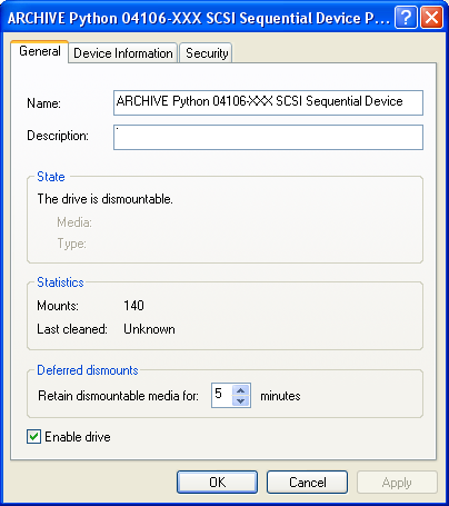 - Right click on the drive and select Properties. You will see a window that should state that your tape drive is working properly.