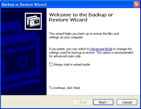 - If the Backup or Restore Wizard appears, click on Advanced Mode as shown below.