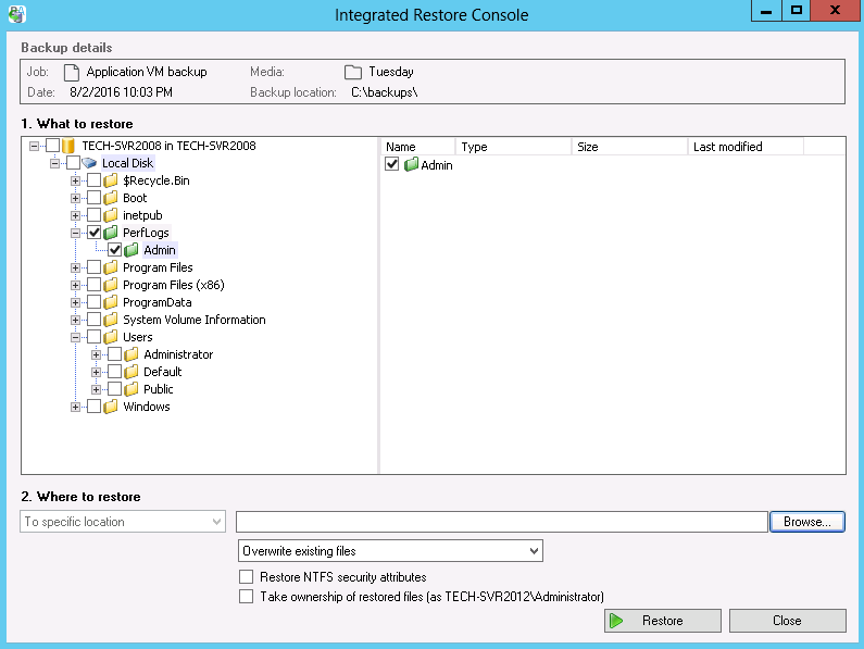 The addition of backup catalog support means the Hyper-V Granular Restore console can also restore data from File Protection and File Archiving backups of Hyper-V environments.