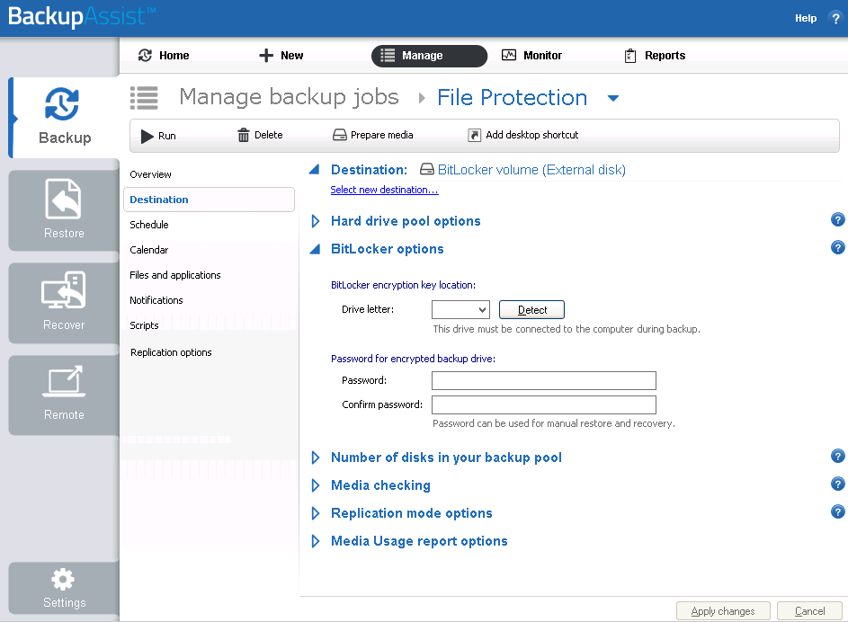 Even better, the encryption process is easy. When you create the backup job, just tick the Enable BitLocker Encryption box during the Media Destination step, and provide the USB flash drive location and password during the Set up destination step. During the Media Preparation step, the external drive will be encrypted and the encryption key will be saved to the USB flash drive.
