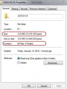 So this is what you would expect it shows that the folder 2009-12-30 has 84 files, 6 folders, and is 12.6MB. If we look at the drive we will also see that the used space increased from 93.2MB to 106MB.
